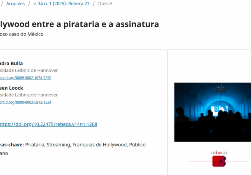 Der Artikel von Alejandra und Kathleen, „Hollywood entre a pirataria e a assinatura“, ist jetzt in Rebeca – Revista Brasileira de Estudos de Cinema e Audiovisual erschienen.