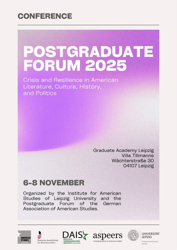 Este año, la 35.ª Conferencia Anual del Foro de Posgrado (PGF) de la Asociación Alemana de Estudios Americanos (DGfA/GAAS) fue organizada y acogida por el Instituto de Estudios Americanos de la Universidad de Leipzig. Del 6 al 8 de noviembre, los estudiantes de doctorado tuvieron la oportunidad de presentar ponencias sobre el tema «Crisis y resiliencia en la literatura, la cultura, la historia y la política estadounidenses».