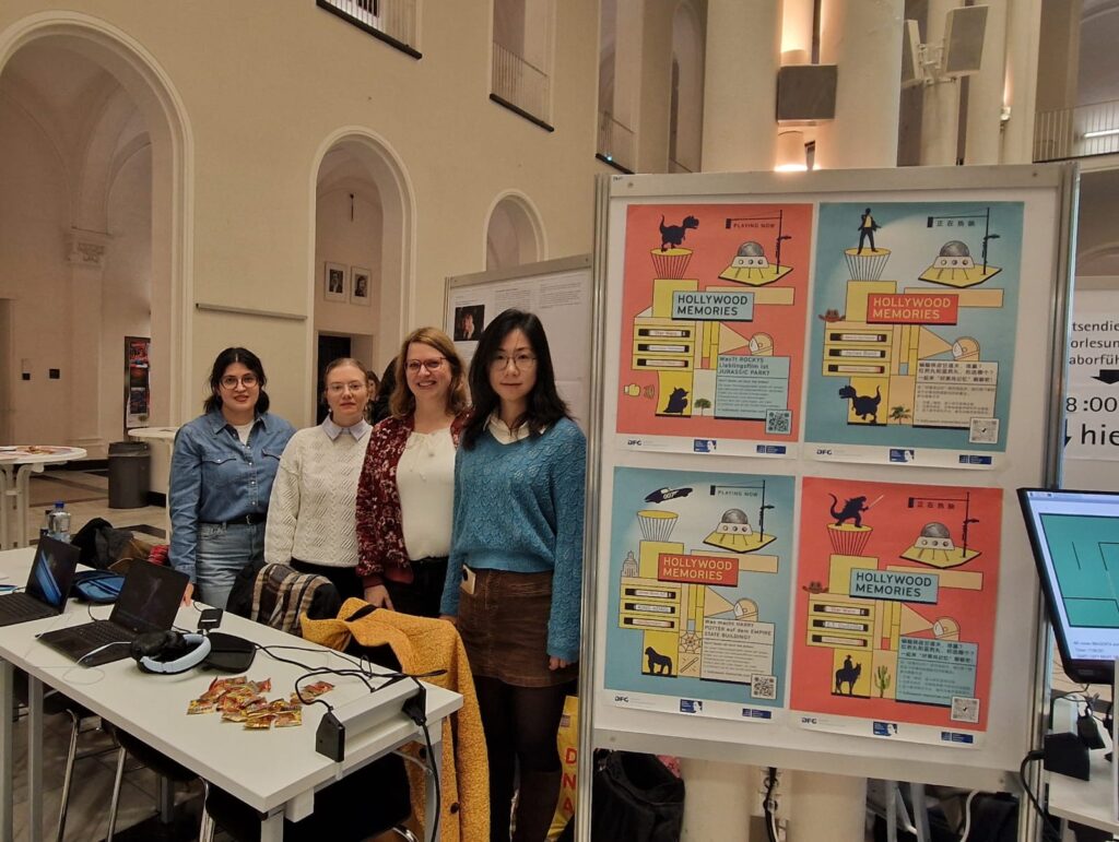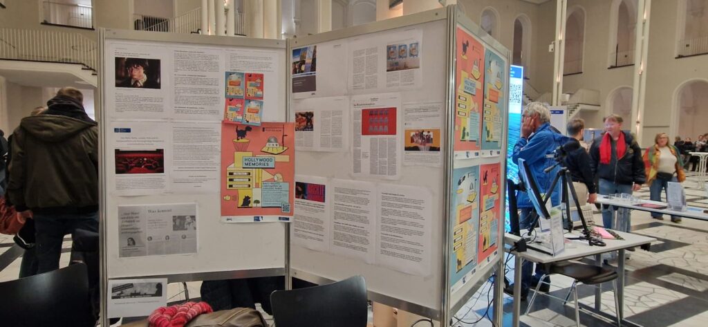 Das Team von Hollywood Memories stellte seine Forschungsarbeit im Lichthof des Schlosses der Öffentlichkeit vor. Die Besucher konnten sich unseren Video-Essay „Between Magic and Realism” ansehen, Fragebögen ausfüllen, um zu erfahren, wie wir unsere Forschung durchführen, und uns Fragen zu unserem Projekt stellen.
